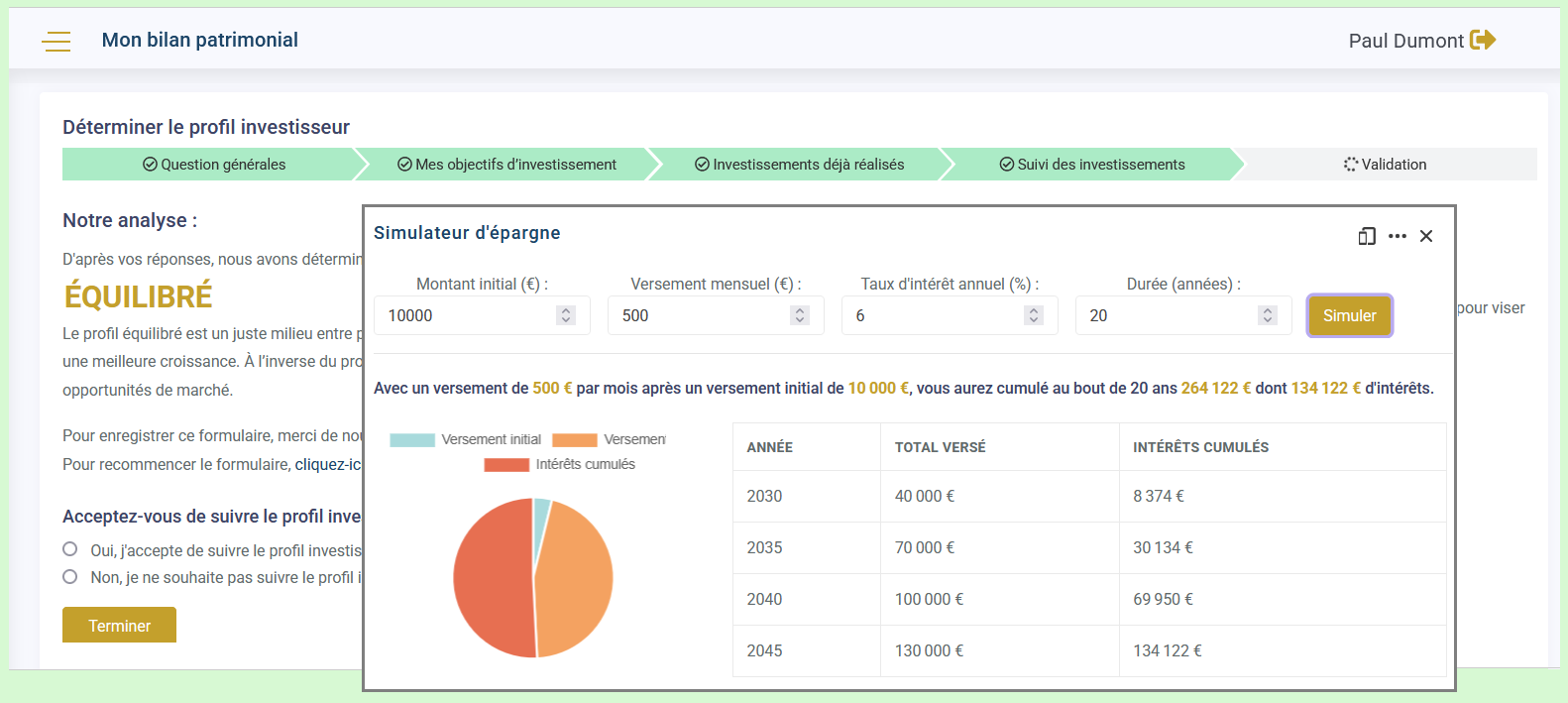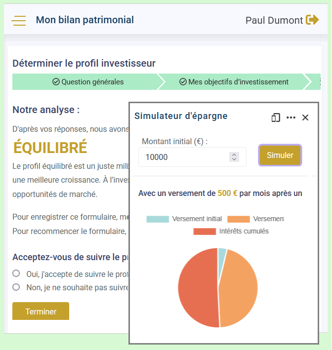 2) L’expertise métier des CGP : Grâce à leur réseau étendu, les CGP peuvent faciliter les connexions entre CGP Conforma et leurs partenaires. Leur connaissance approfondie du métier leur permet de valider la fiabilité des calculs des simulateurs, la qualité des rendus des bilans patrimoniaux, ainsi que la pertinence des formulaires comme le recueil des objectifs ou l’évaluation du profil de risque des clients par exemple.